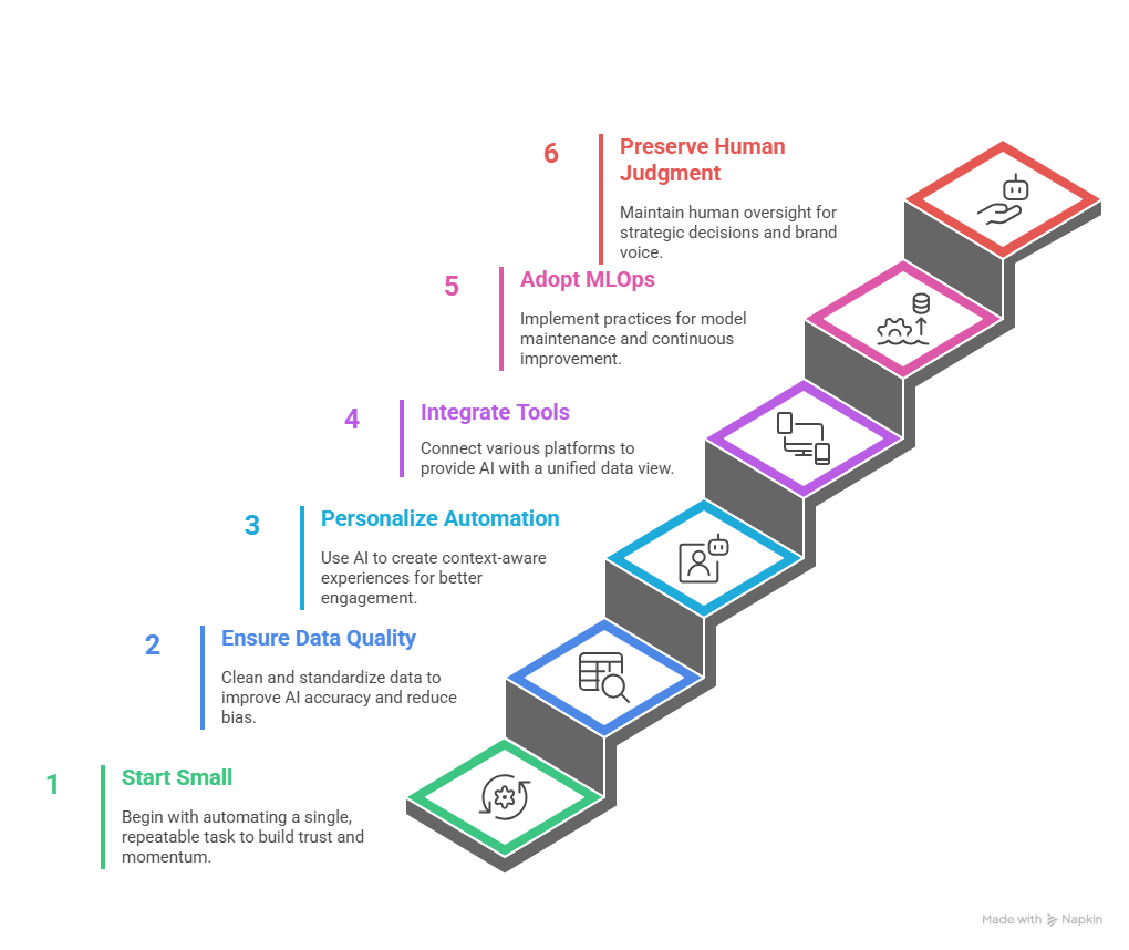 AI is only as good as the data it learns from. Audit your CRM, standardize event names, and remove duplicates. If your customer profiles are messy, predictions will be noisy. Clean data gives you faster wins and reduces bias.