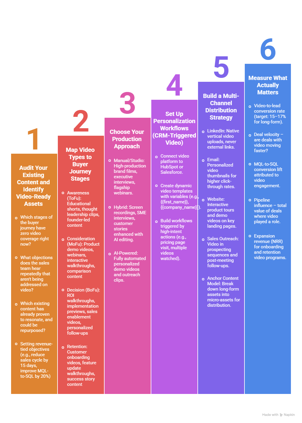 - Decision (BoFu): ROI walkthroughs, implementation previews, sales enablement videos, personalized follow-ups