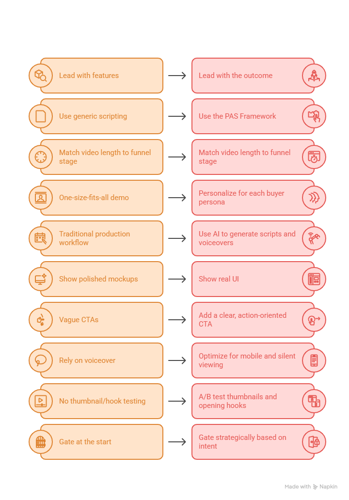 To recap what moves the needle most: lead with outcomes, not features. Personalize for every stakeholder on the buying committee. Match your video length to the funnel stage. Show real UI. Gate strategically. And always, always tie your performance metrics back to the pipeline, not just views.