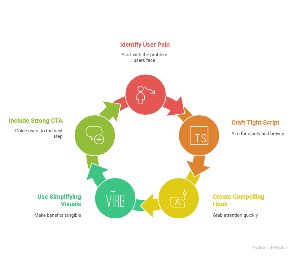 - Visuals that simplify: Use motion graphics for abstract flows; use screencasts to prove the UI works. Pick the style that makes the benefit tangible.