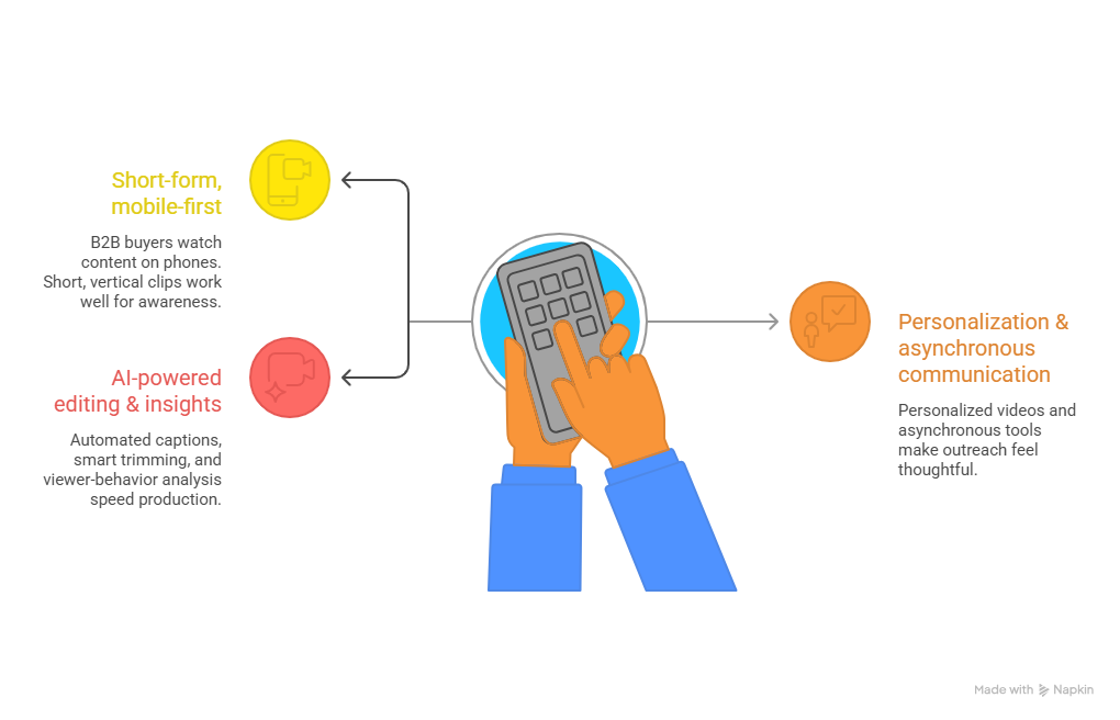 Short-form, mobile-first: B2B buyers watch content on phones during commutes or in between meetings. Short, vertical clips that hook in the first 3–10 seconds work surprisingly well for awareness.