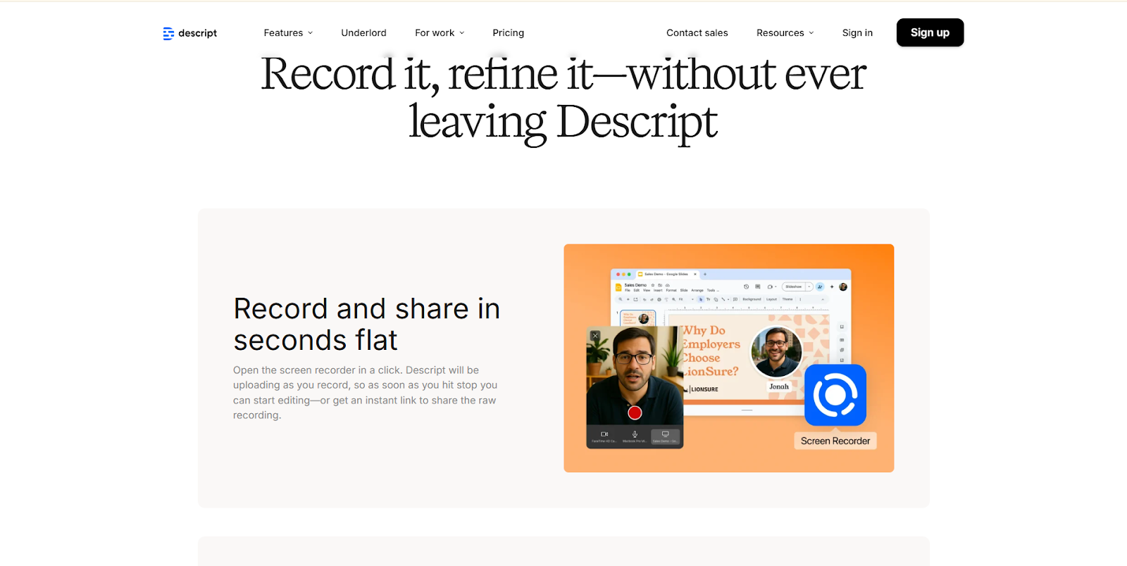Descript takes a unique text-based editing approach, meaning you edit your video by editing its transcript. This approach feels natural and fast, especially when your content is built on dialogue, interviews, or long presentations.