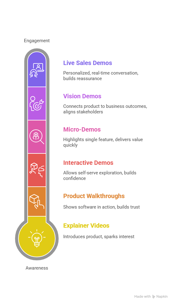 The most successful SaaS teams don’t rely on just one format. They build a demo ecosystem that supports every stage of the buyer journey.